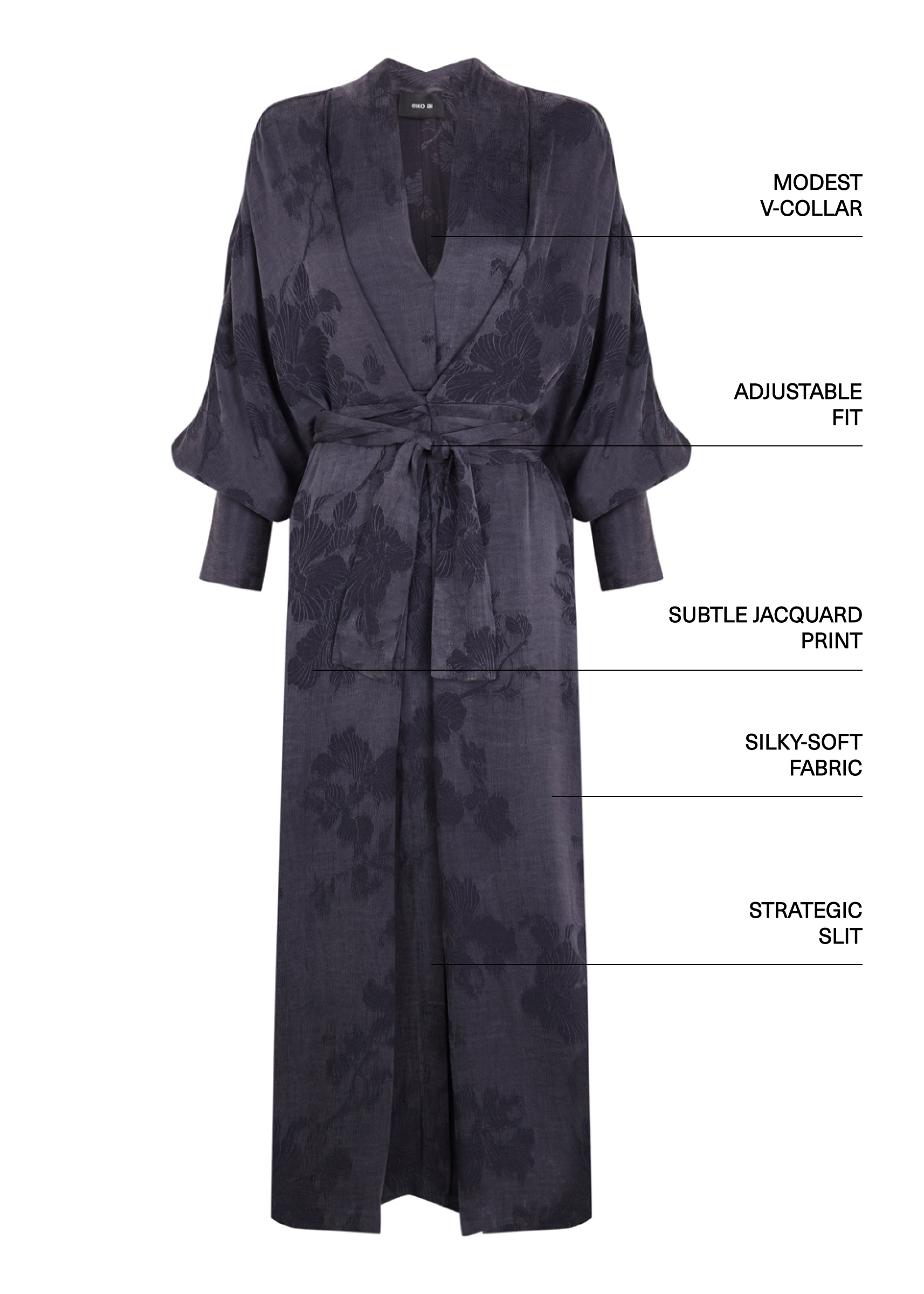 The Freya Kimono dress is designed with a fully adjustable wrap belt, allowing it to comfortably fit various body types.