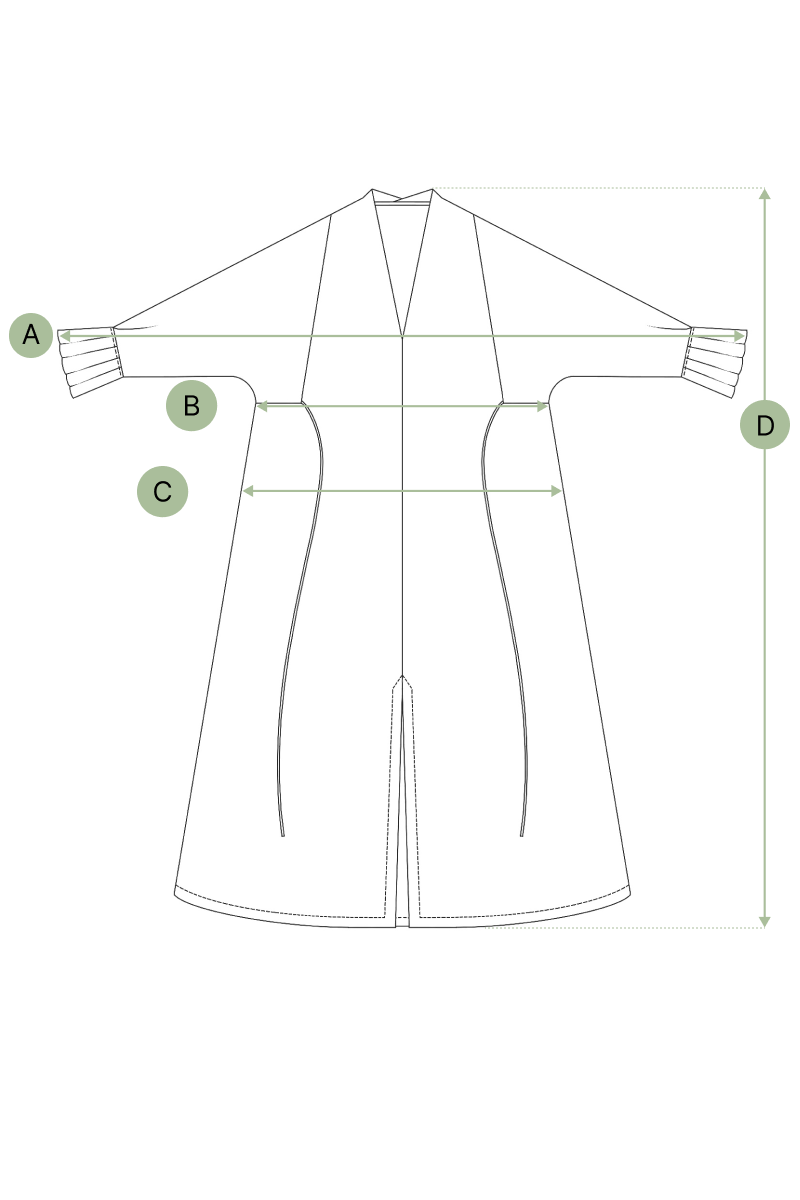 The Gaia Kimono features an oversized, adjustable fit with a long spaghetti belt to wrap around the waist. It includes pleated cuffs adorned with metallic golden buttons, a V-collar, and a central peekaboo slit in the front of the dress.