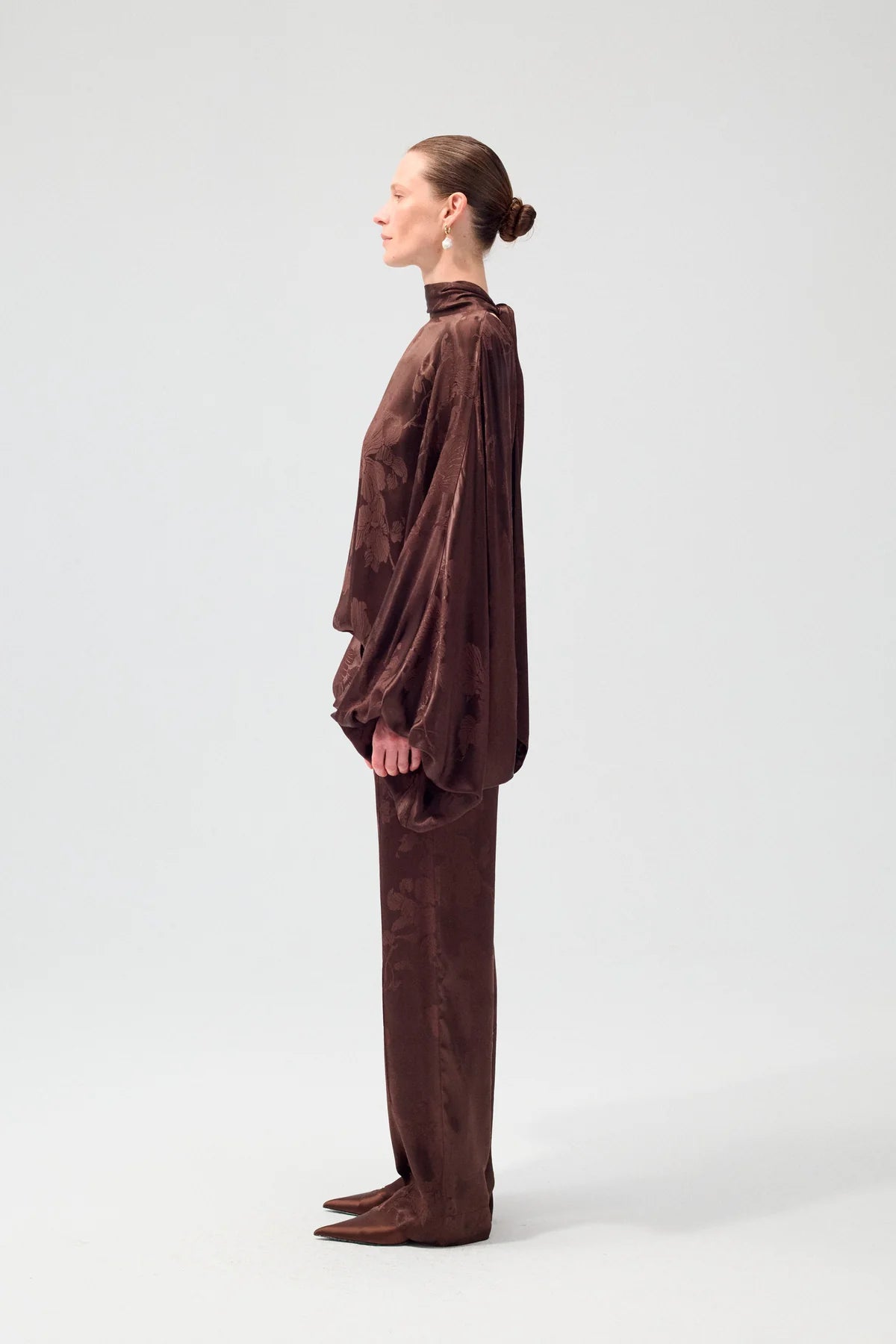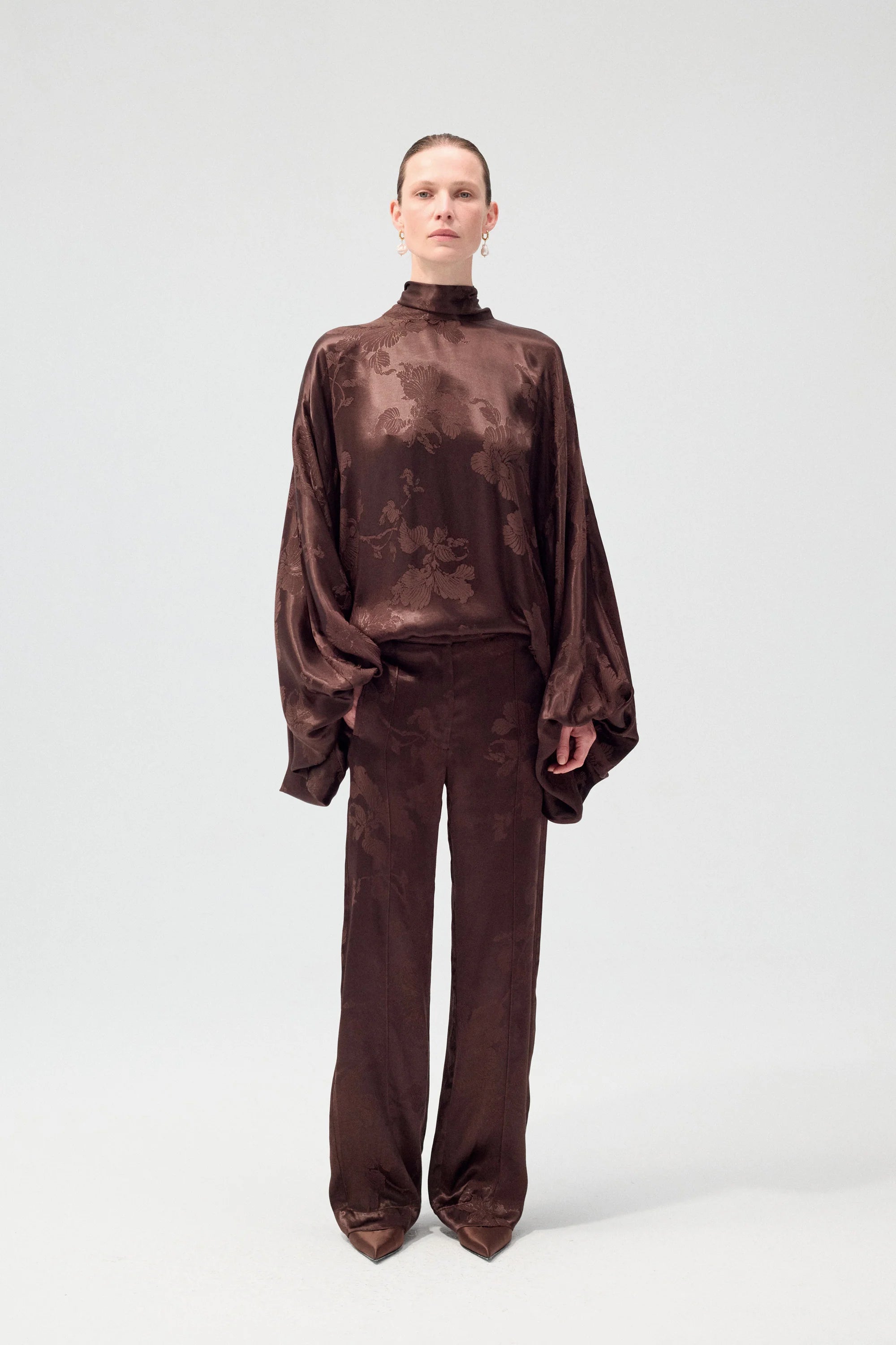Textured jacquard in a warm umber tone—smooth, relaxed, and quietly refined.