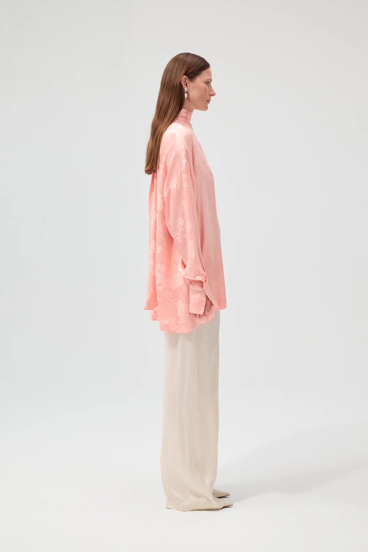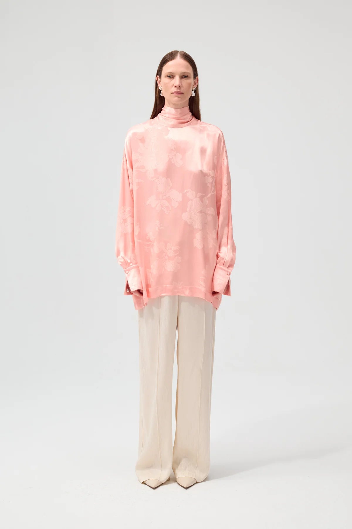 A pale blush jacquard—soft volume, calm shape, and a refined finish.