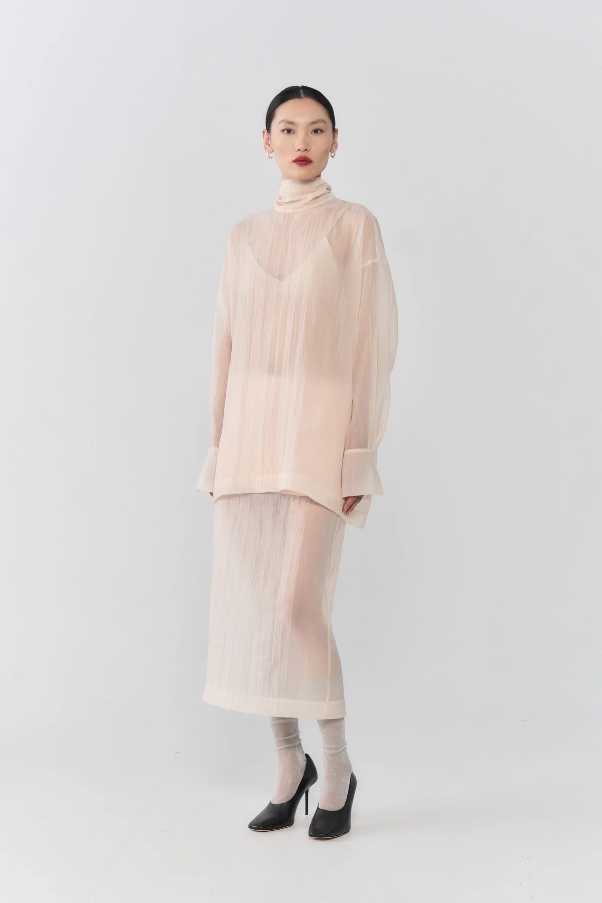 Sheer ivory layers in a clean, flowing shape—delicate, modern, and softly structured.