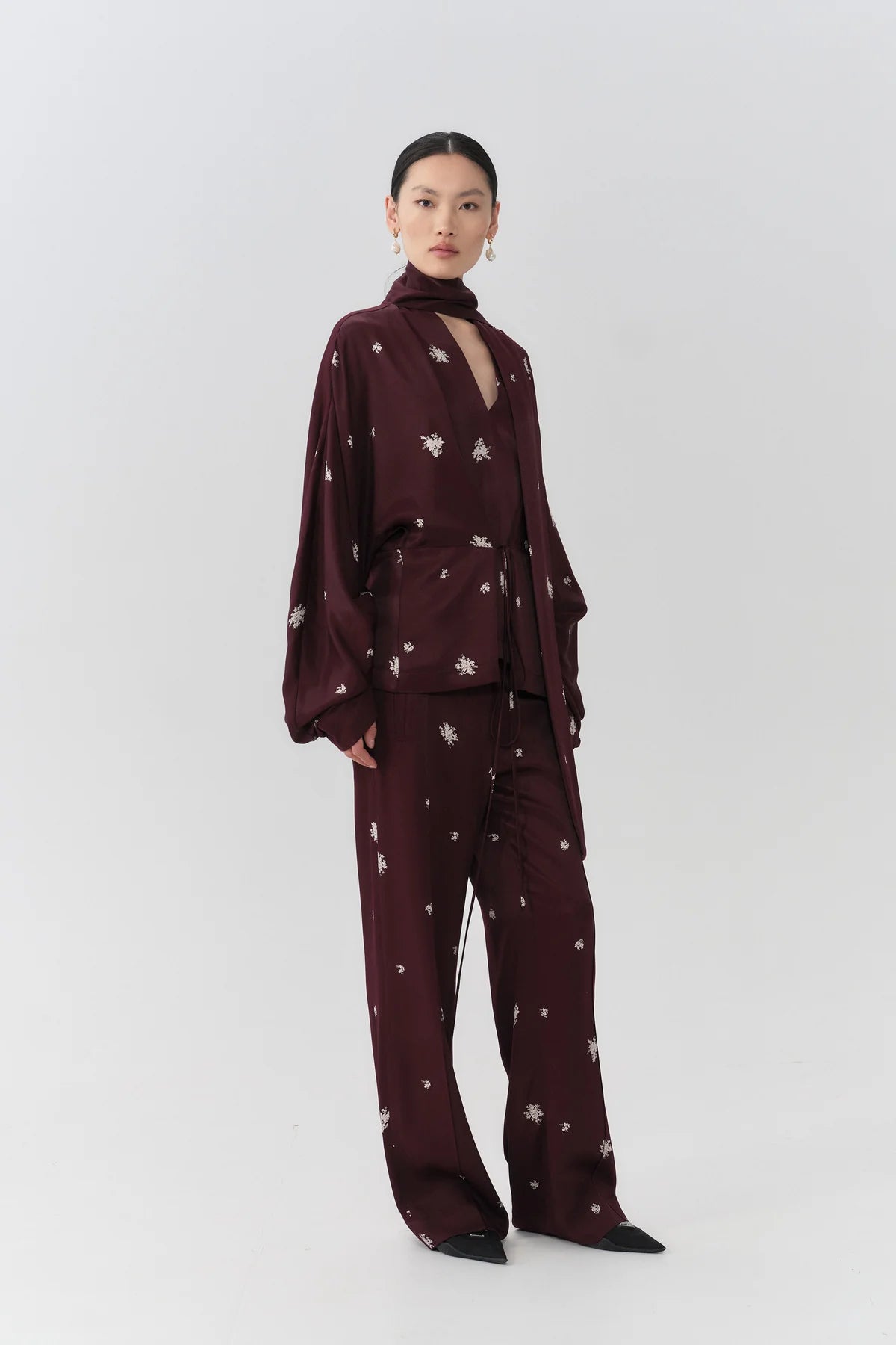 A fluid monochrome pairing in rich cherry hues—striking, confident, and beautifully cohesive.