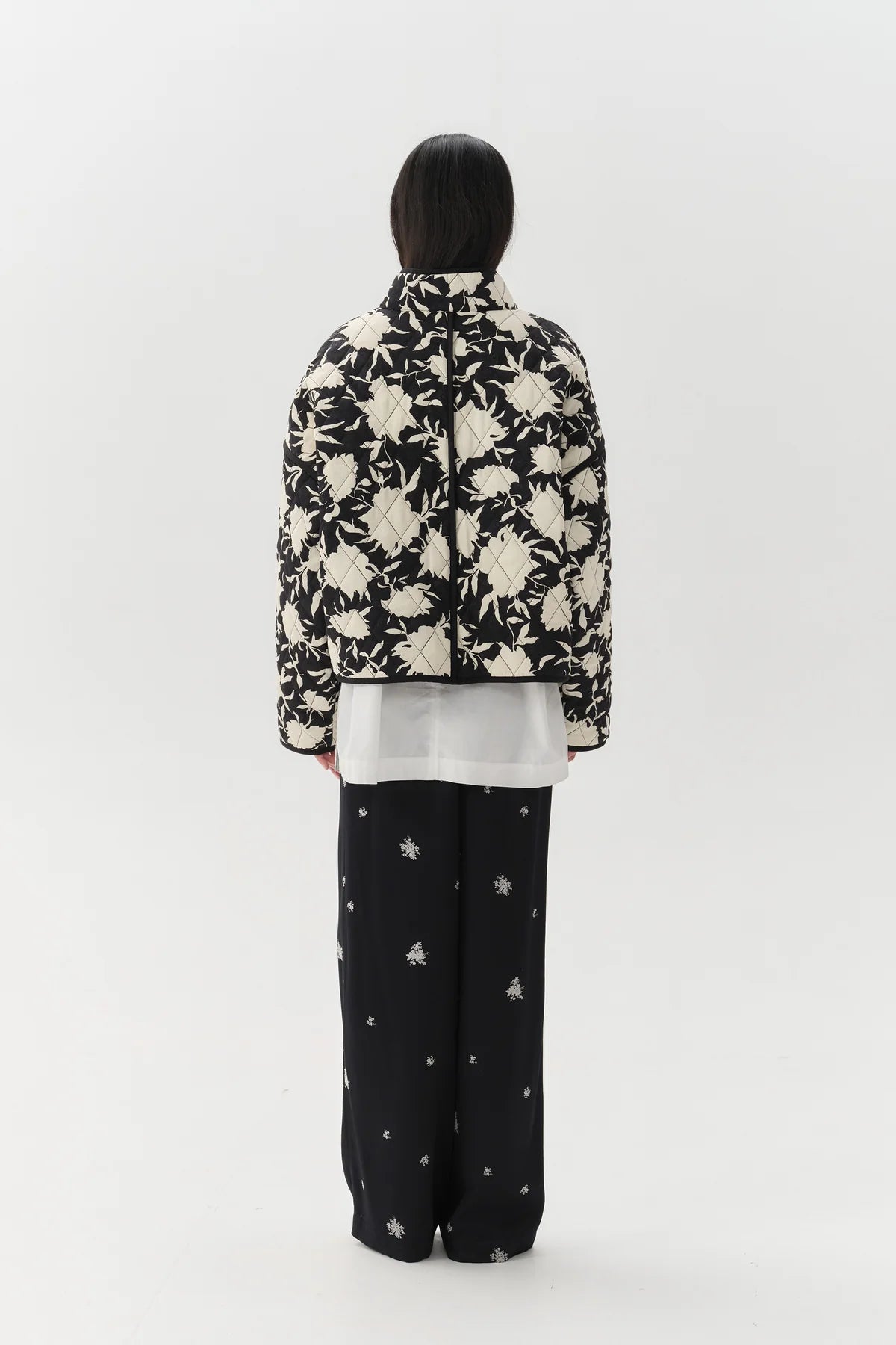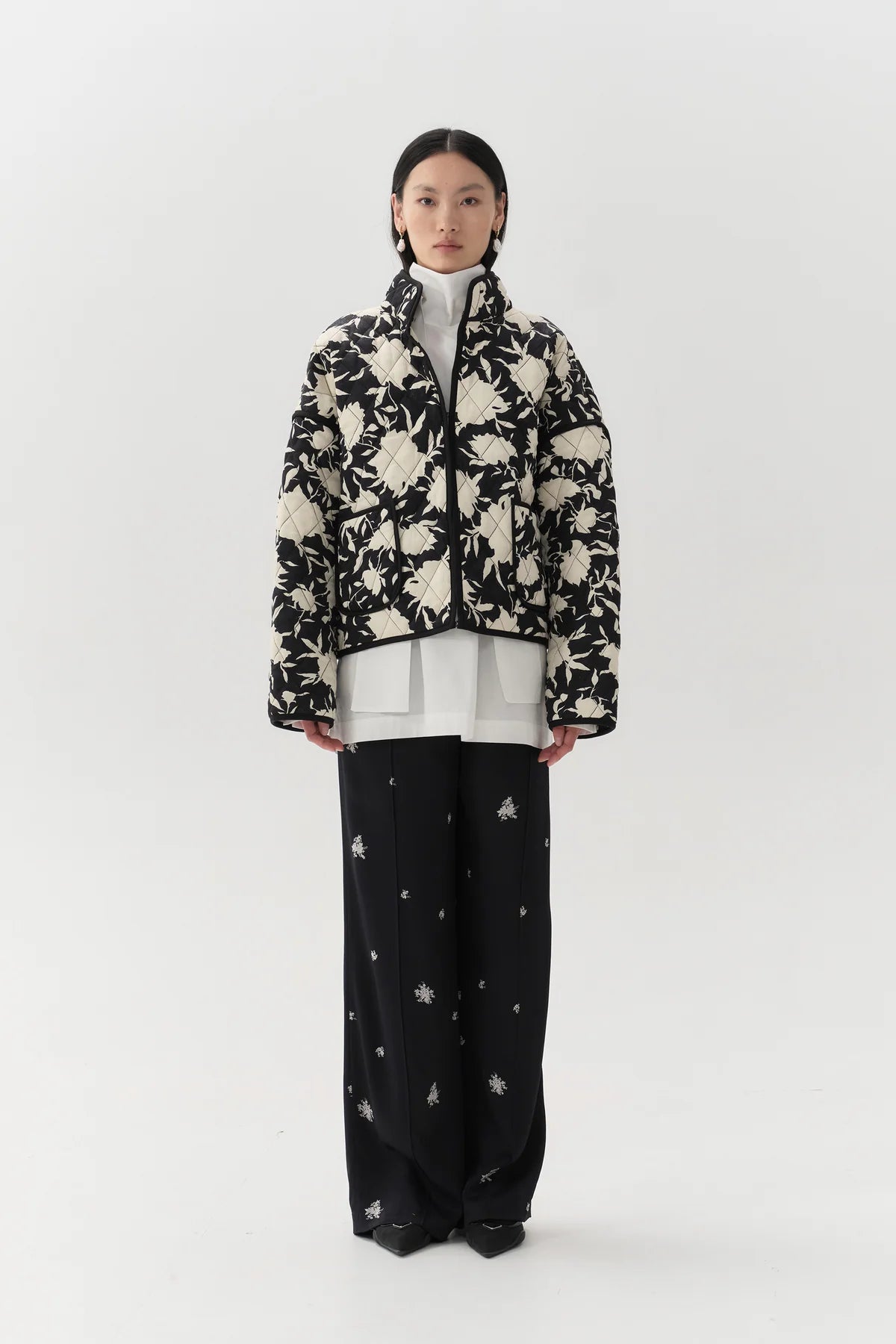 A graphic outer layer over soft ivory and midnight stems—warm, sculptural, and effortlessly modern.