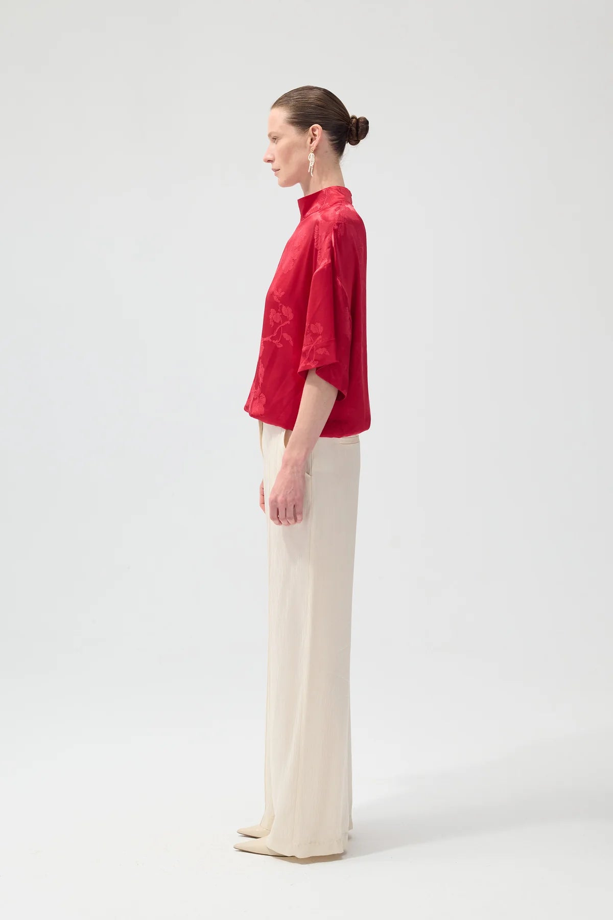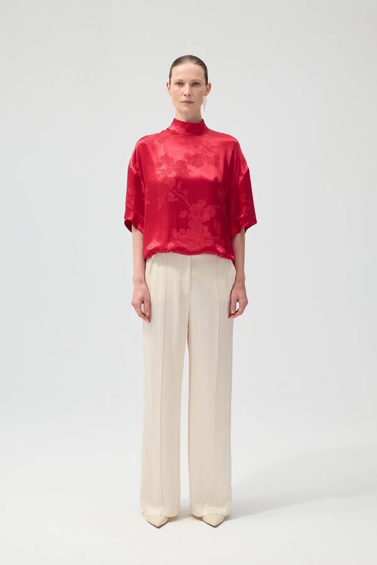 A luminous crimson jacquard paired with clean ivory tailoring—bold yet undeniably refined.