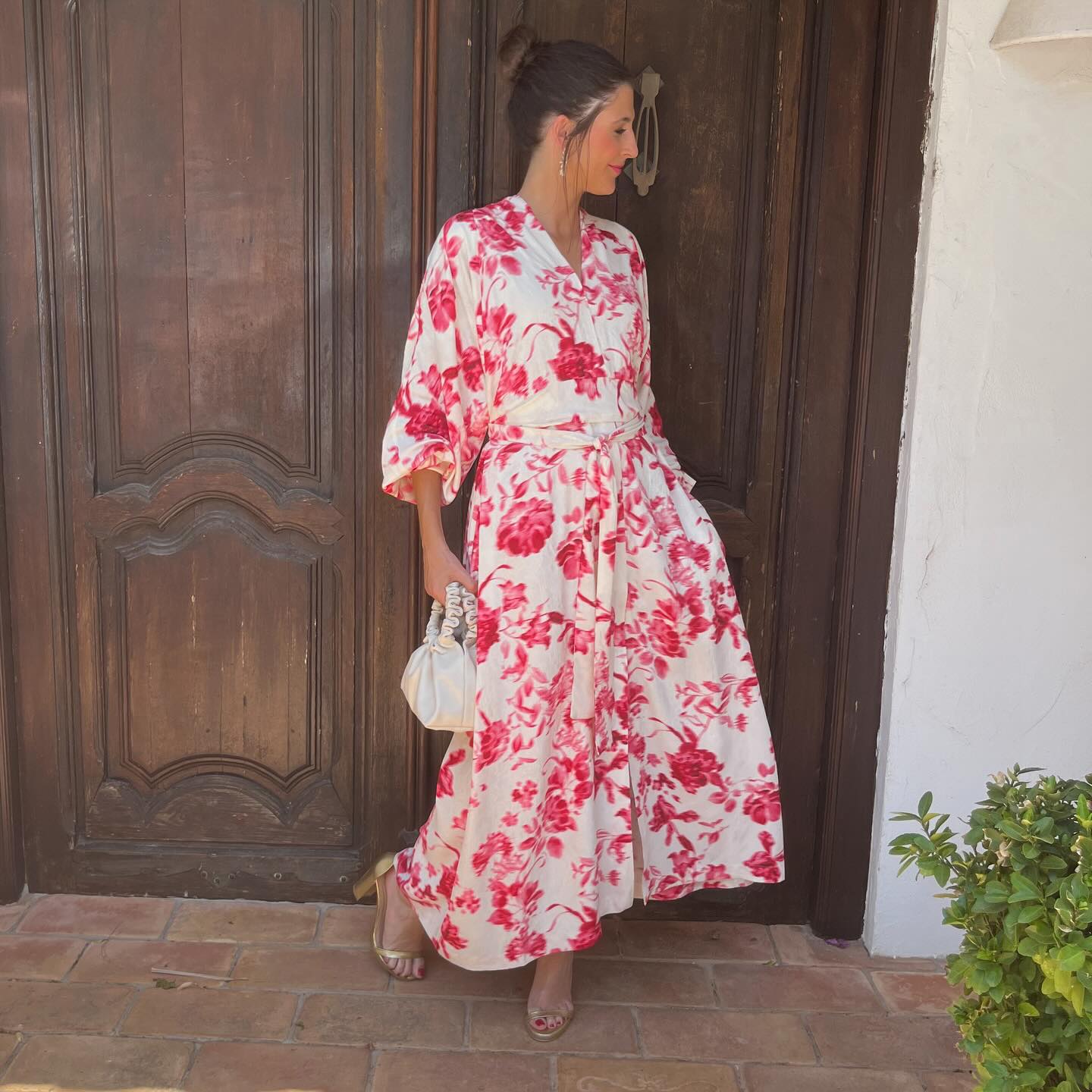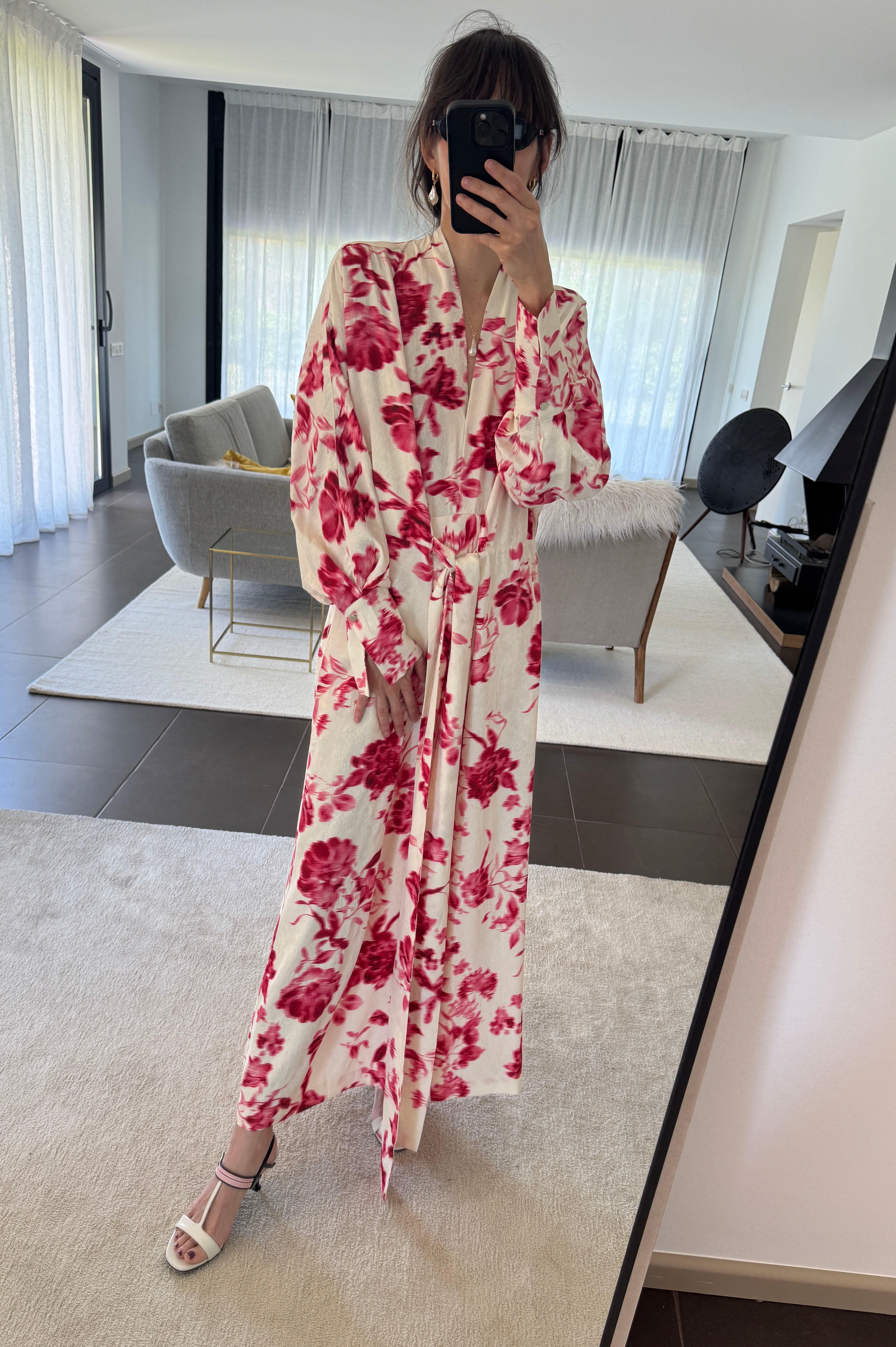 Kimono dress crafted from fluid jacquard in a vibrant floral pattern. Features a V-neckline, central slit, and an adjustable waist belt for a defined silhouette. Relaxed sleeves finish in soft cuffs with metallic silver buttons. Thoughtfully designed to flatter a range of body shapes.